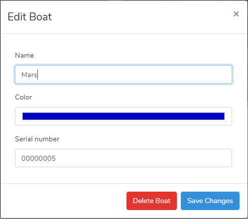 To add a boat to the list, click the blue "Add Boat" button. Name the boat and specify a color for its icon. You have to enter the serial number of your device to obtain a personalized key.