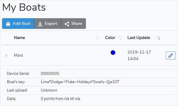 Now the boat appears in the "My Boats" list. Click the arrow button to the left of its name. Locate the Boat Key in the expanded pane. You need to enter it in your Device settings (see the Configure Your Device section).