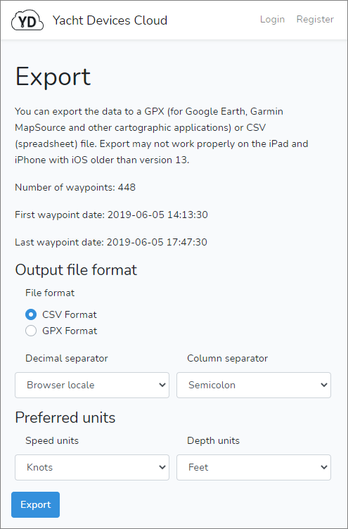 You can download your tracks from the Yacht Devices Cloud by clicking the "Export" button.