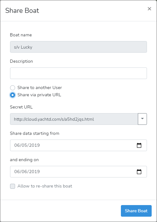 Select a boat and click the "Share" button. If you share your data with another Yacht Devices Cloud user, you need to know their registration email address. Sharing via URL opens your tracks to any unregistered user who has the link. You may specify a time window to share your data, give your voyage description, and set the "Allow boat re-sharing" flag.